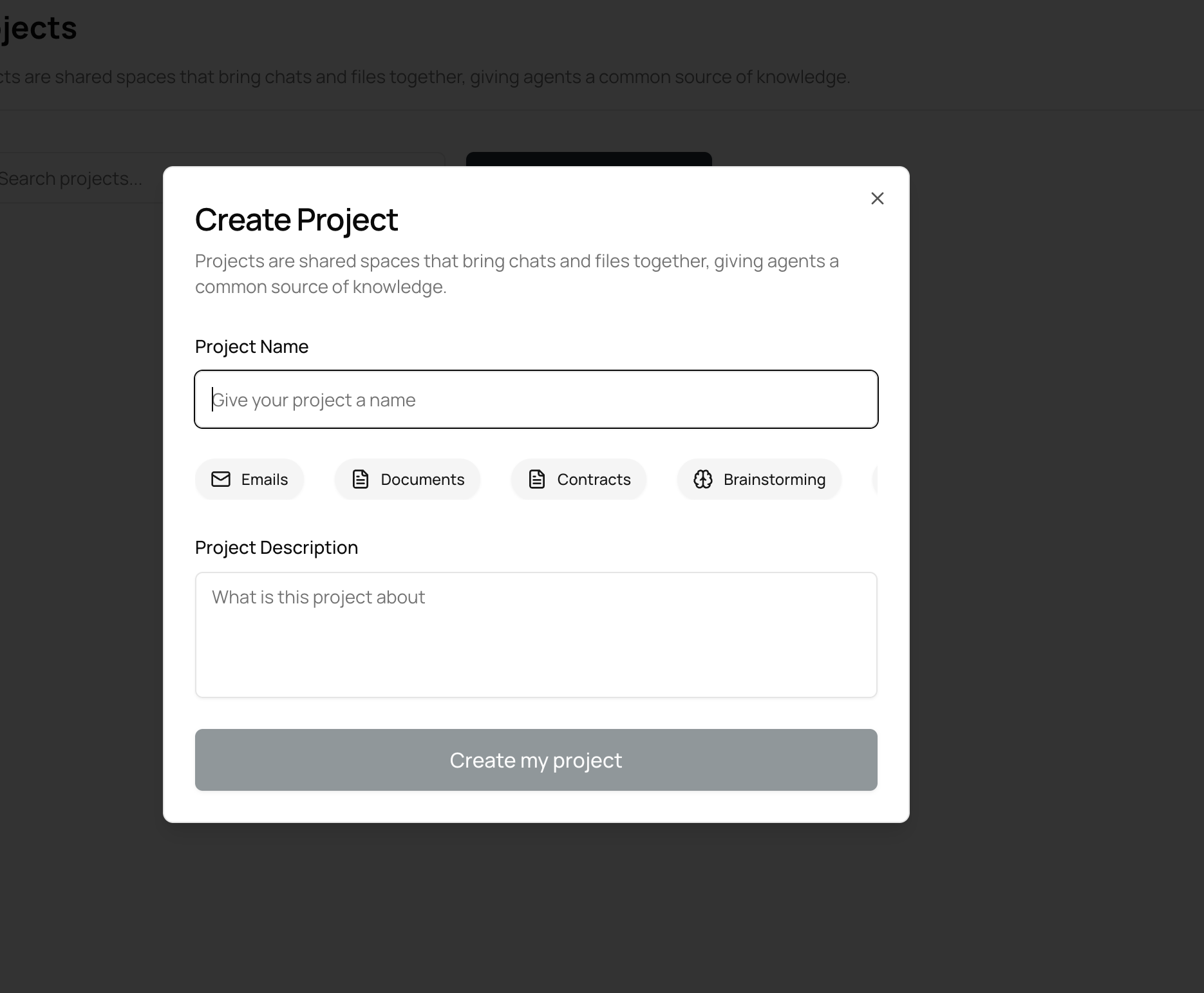 A Project is a focused workspace that keeps your related work together. It groups your chats with AI agents, your files and the working memory for that topic so you and your teammates always see the same context.