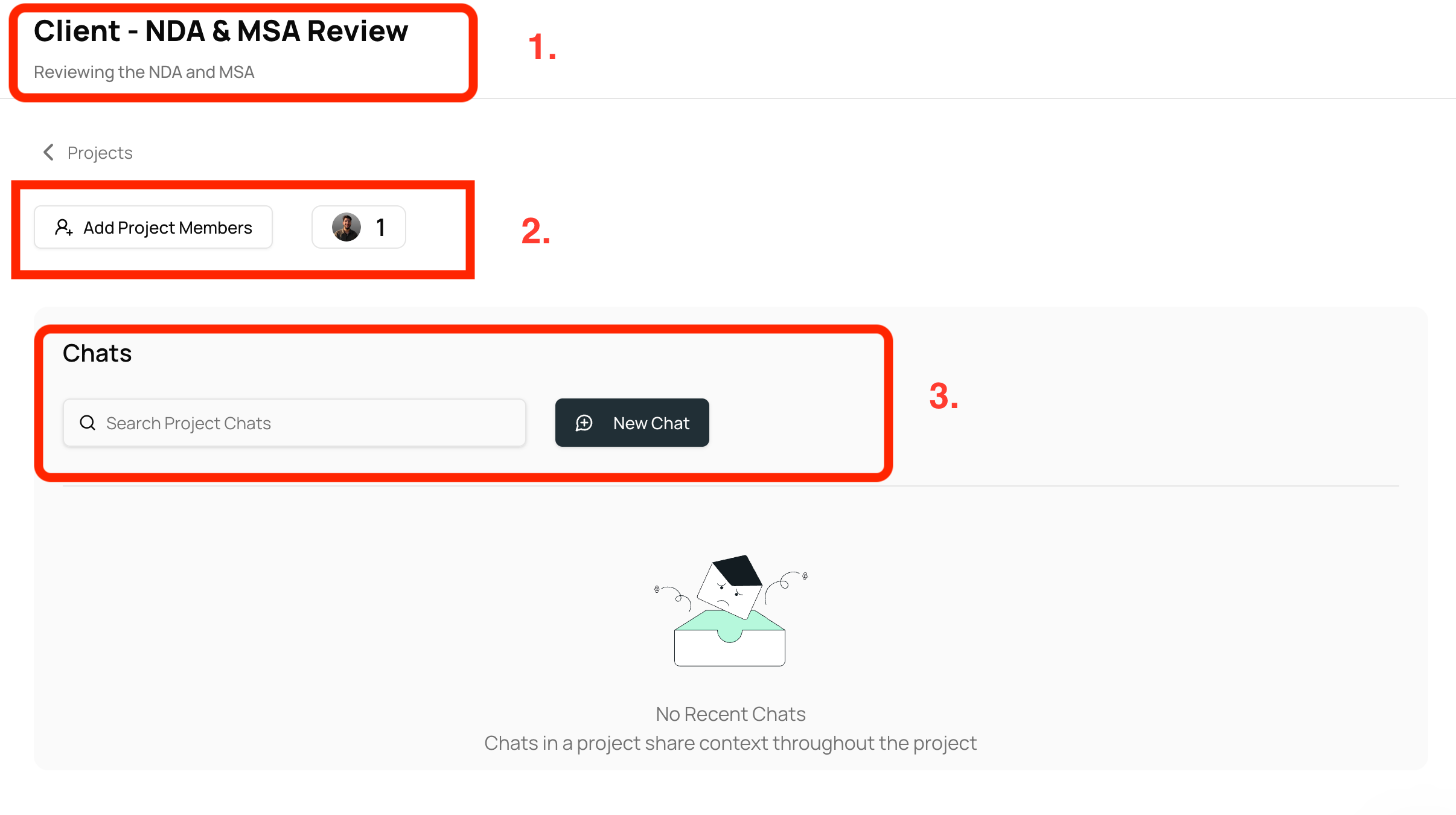 3. Chats area where you can start conversations with AI agents about this Project.
