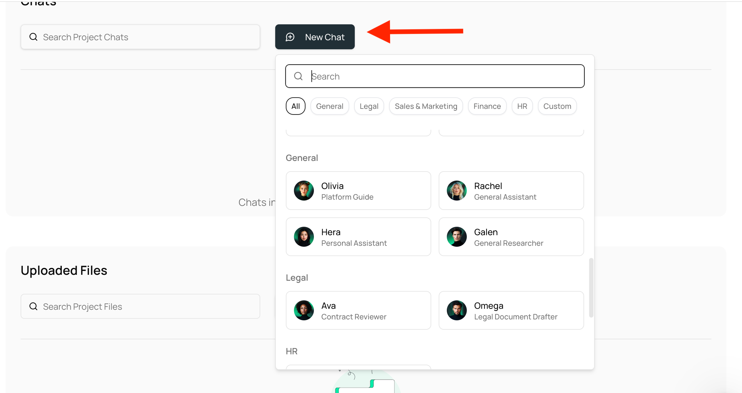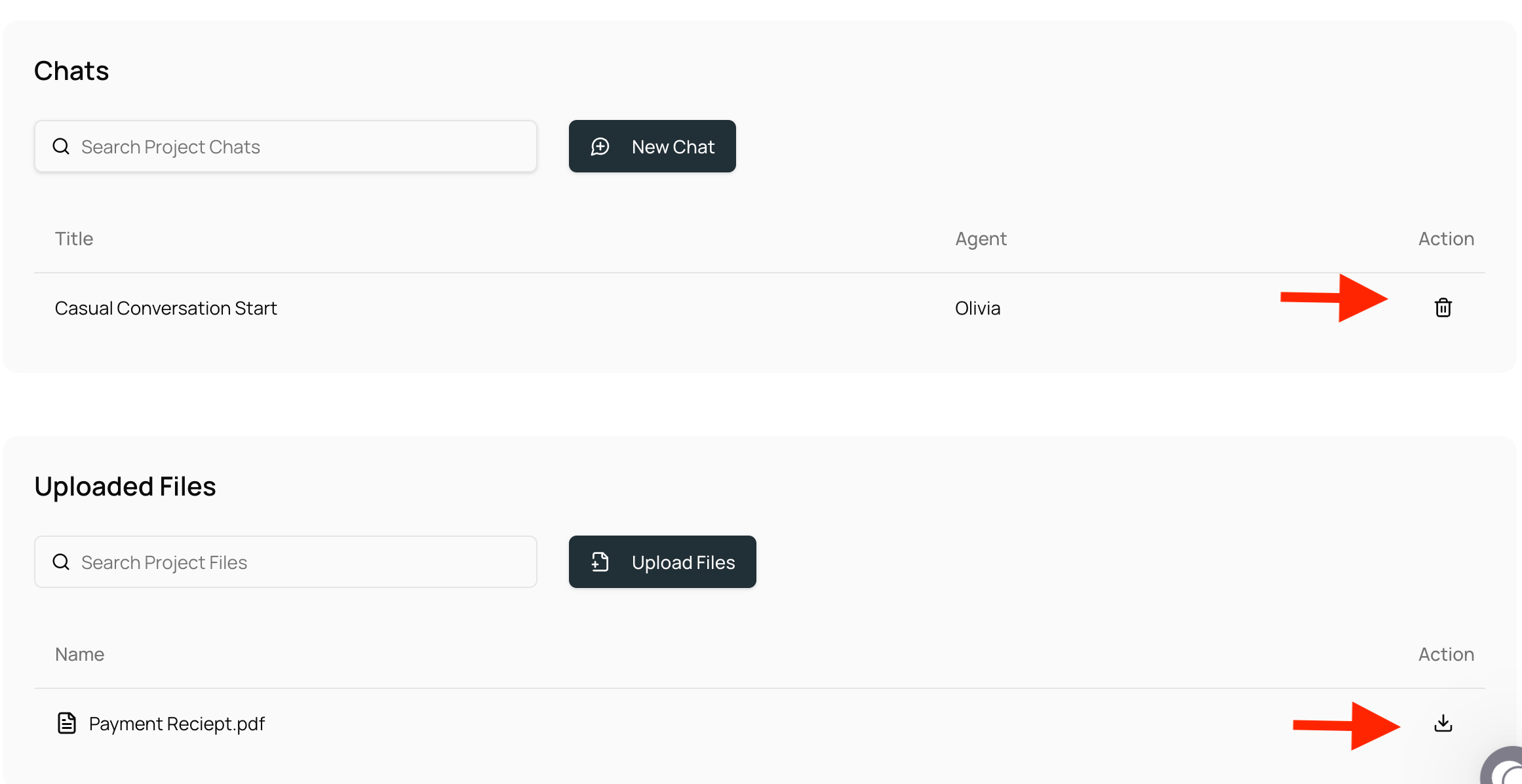 • Automatic saving: Files you upload inside a chat with any agent are automatically saved to that Project. No need to upload twice in the project page.