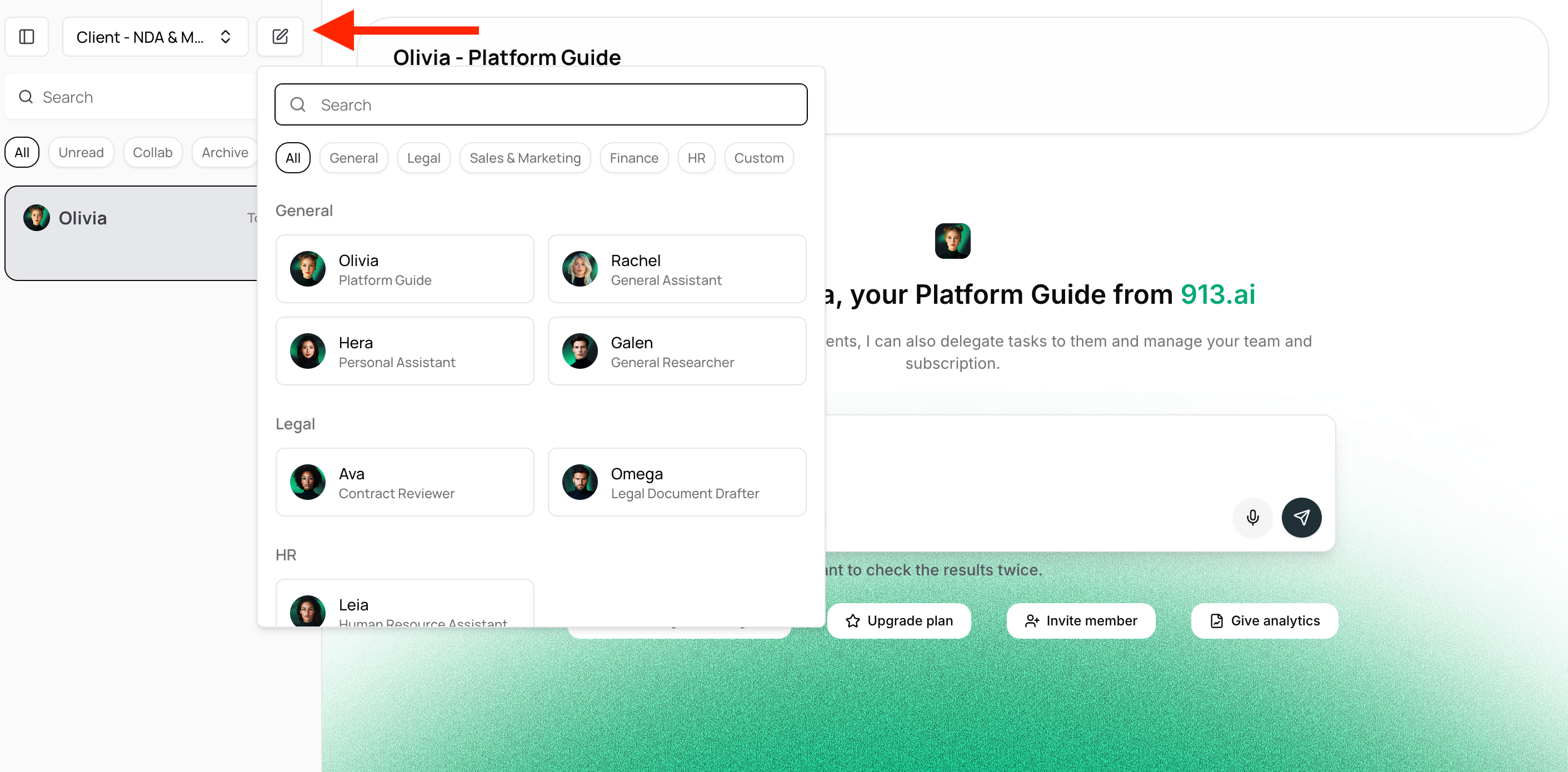 1. Start a new chat. Click New chat, choose the agent you want and the inbox opens.